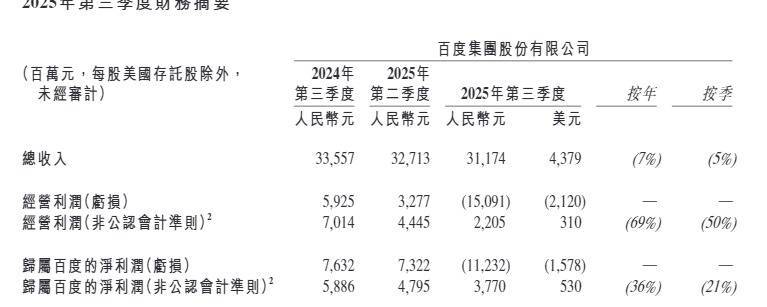 【大河财立方 记者 司高妍】11月18日晚,百度发布2025年第三季度财报。财报显示,第三季度百度总营收312亿元,同比下降7%,核心营收247亿元。