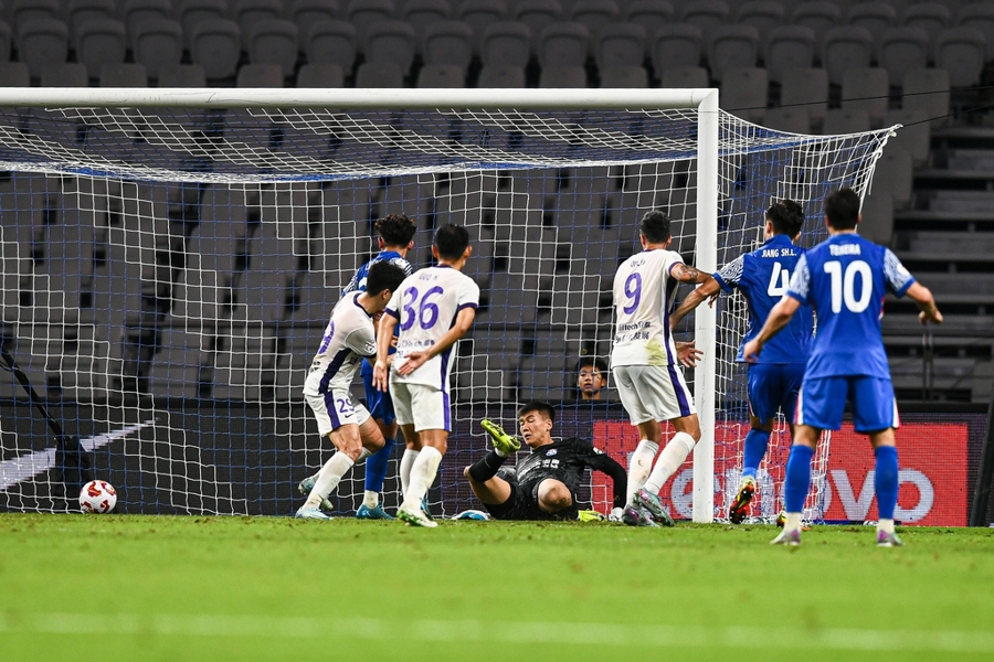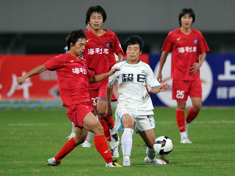 申花(蓝)和天津津门虎(白)两次均遭罚分