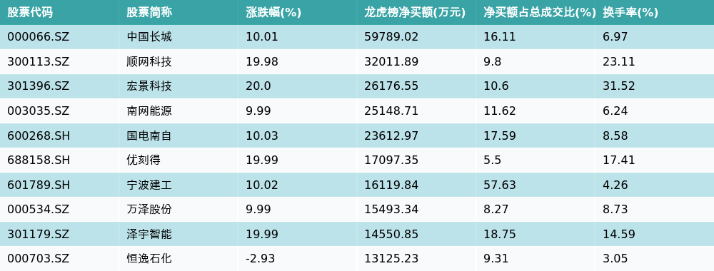 南财智讯3月9日电,盘后数据显示,因当日异动登上龙虎榜的个股中,资金净买入最多的前三位分别是中国长城(000066.SZ)、顺网科技(300113.SZ)与宏景科技(301396.SZ)。其中排名第一的中国长城净买额达5.98亿元,占总成交金额的16.11%。中国长城当日收盘上涨10.01%,换手率为6.97%,净买入额前10个股详情见下图: