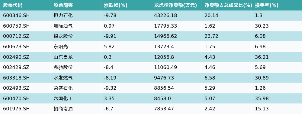 南财智讯3月9日电,盘后数据显示,因当日异动登上龙虎榜的个股中,龙虎榜中资金净流出最多的前三位分别是恒力石化(600346.SH)、洲际油气(600759.SH)与锦龙股份(000712.SZ)。其中排名第一的恒力石化被净卖出4.32亿元,占总成交金额的20.14%。恒力石化收盘下跌9.78%,换手率为1.3%。净卖出额前10个股详情见下图: